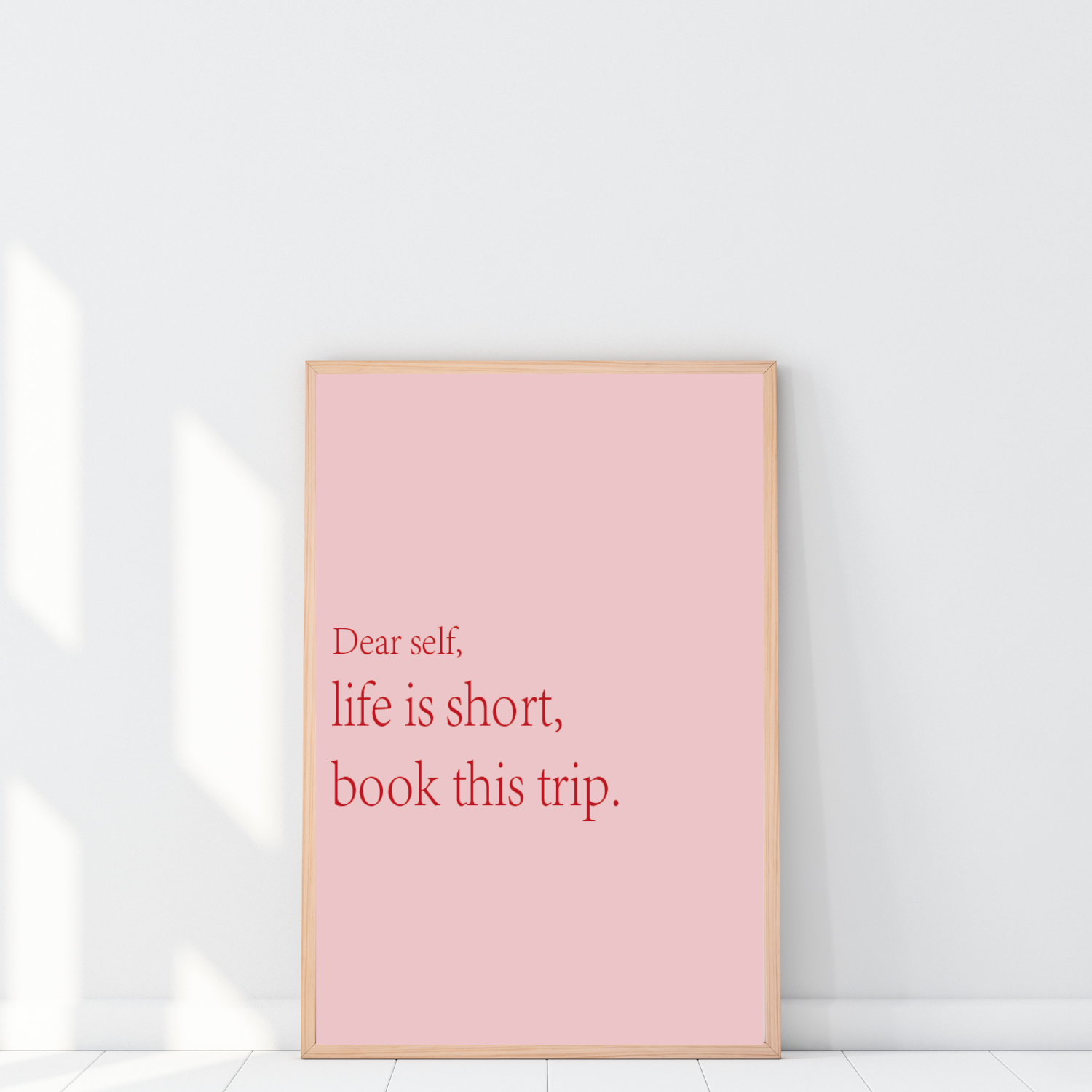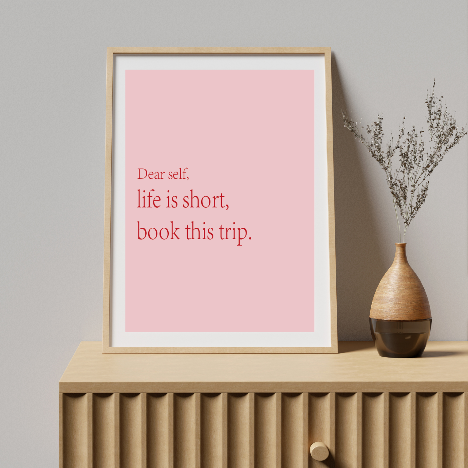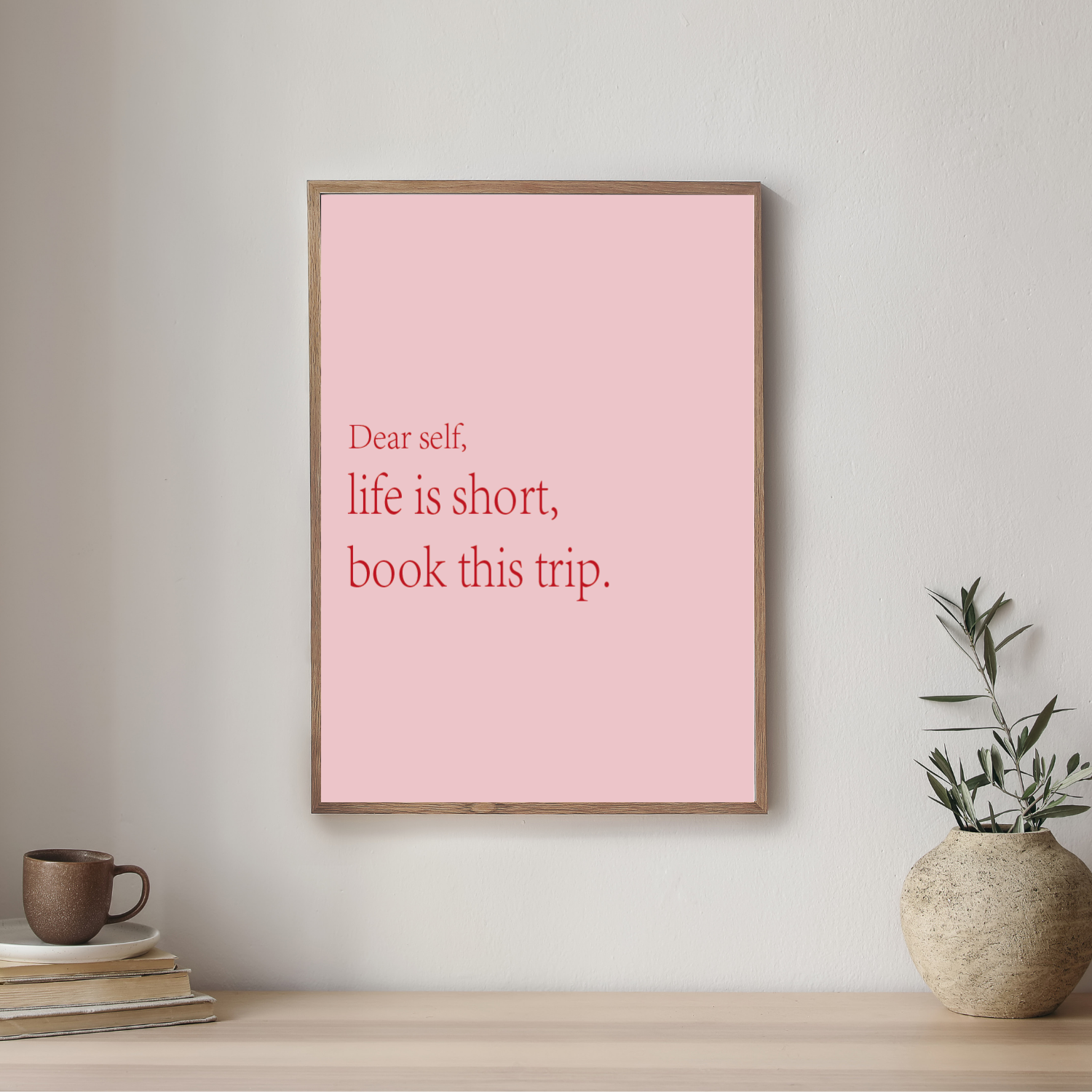 Plakat do salonu Book this trip zabawna i trafnie opisująca życiowe dylematy dekoracja ścienna. Będzie pasowała wszędzie tam, gdzie czujesz, że brakuje Ci kolorów na ścianie.