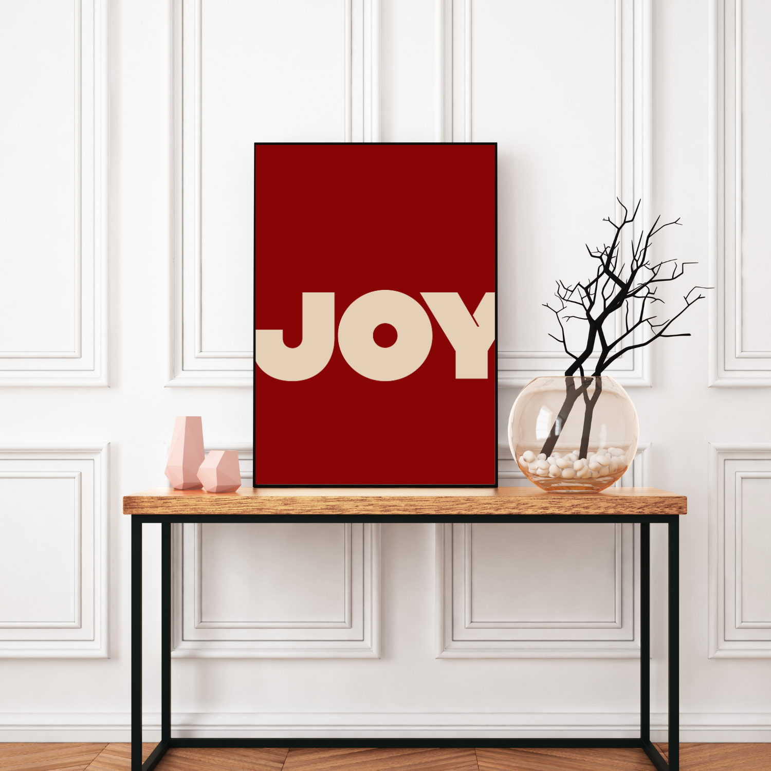 Intensywnie czerwony Plakat z napisem JOY to zaproszenie dla Ciebie do szukania radości w małych rzeczach i ulotnych chwilach.