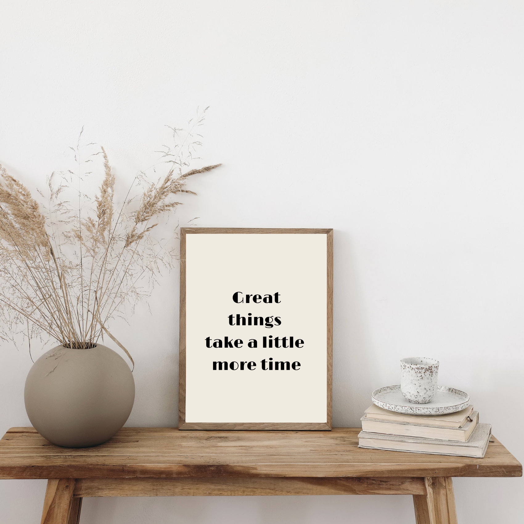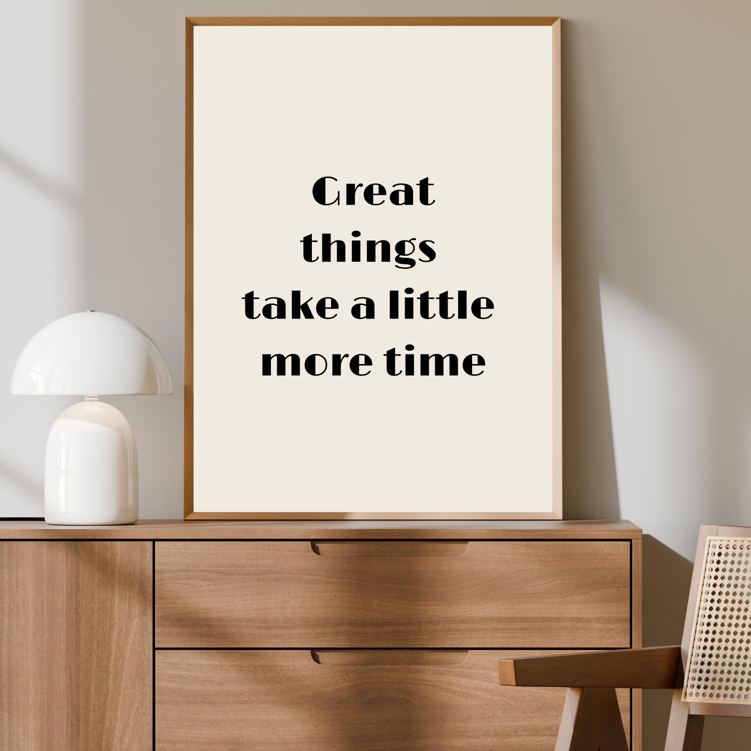 Plakat motywacyjny z napisem Great things take a little more time to kompozycja z wyraźnym przesłaniem. Będzie działać jak Twoje codzienne przypomnienie, że sukces i wartościowe cele po prostu wymagają większej ilości czasu.